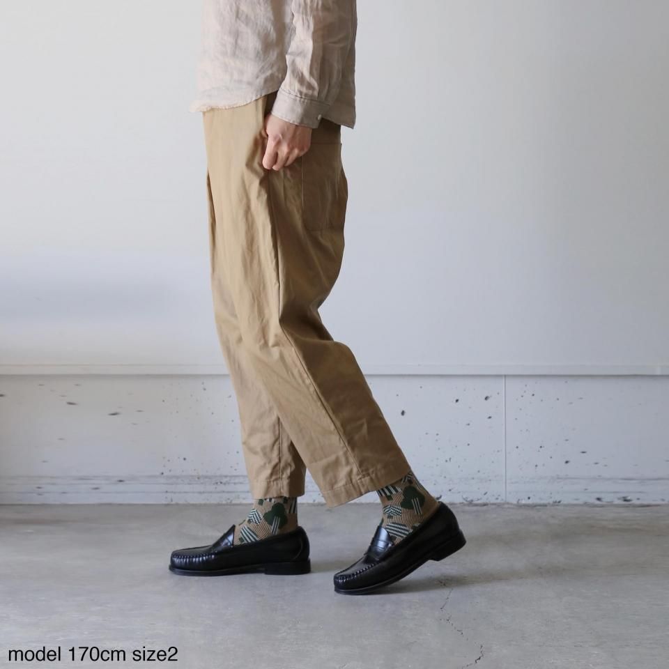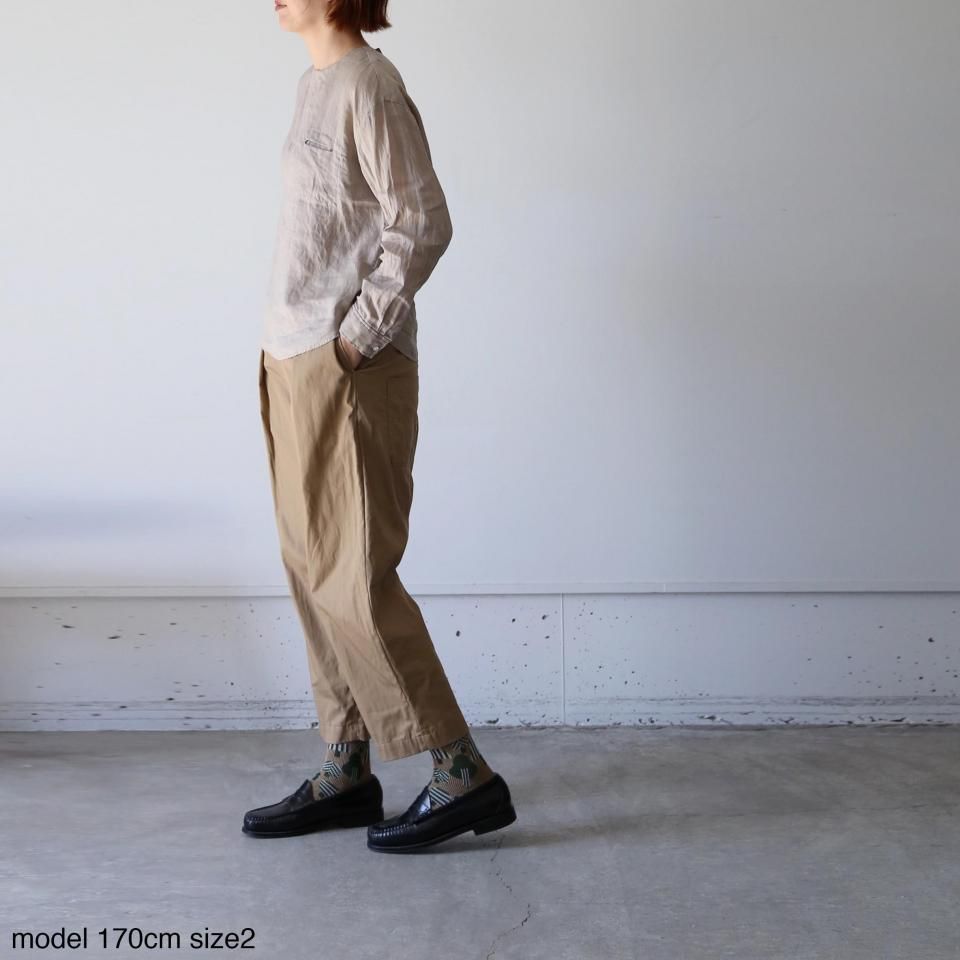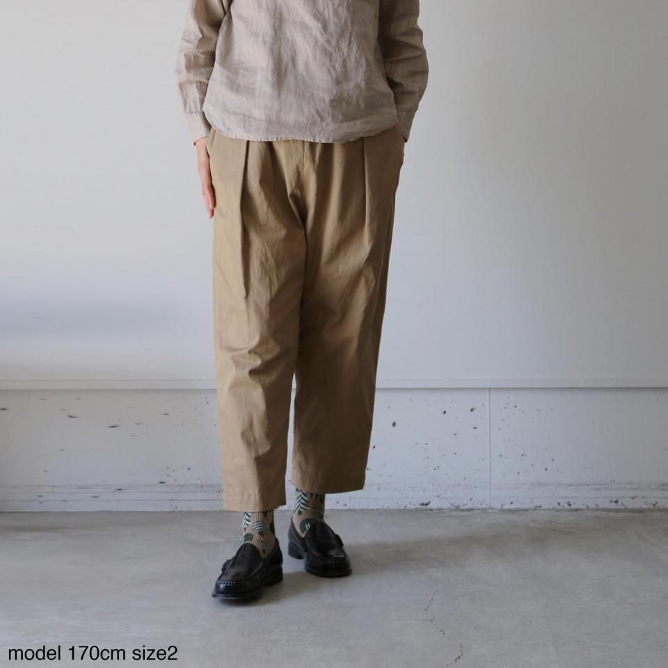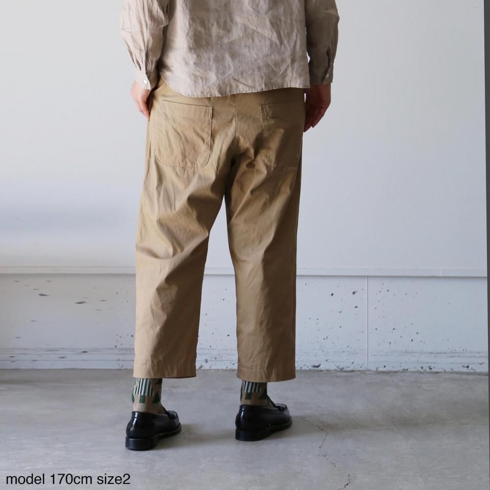 ヒップまわりにゆとりのある8分丈パンツです。 ビンテージチノクロスのハリ感で、やわらかな丸いフォルムが引き立ち、裾に向かってゆったりテーパードなラインに仕上がっています。足首が見える丈感で、バランスよく肌見せして大人の抜け感を楽しんだり、ソックスで足元をポイントにしたり。 ウエストは幅広ゴムで、楽な穿き心地です。 カジュアルダウンしすぎない素材感なので、お仕事などにもデイリーに活躍し、ワードローブに欠かせないパンツになってくれそうです。 【商品在庫について】 web shopの在庫管理には注意を払っておりますが、実店舗で販売も行っているため、web shopへの在庫反映が若干遅れてしまう場合がございます。どうぞご了承ください。