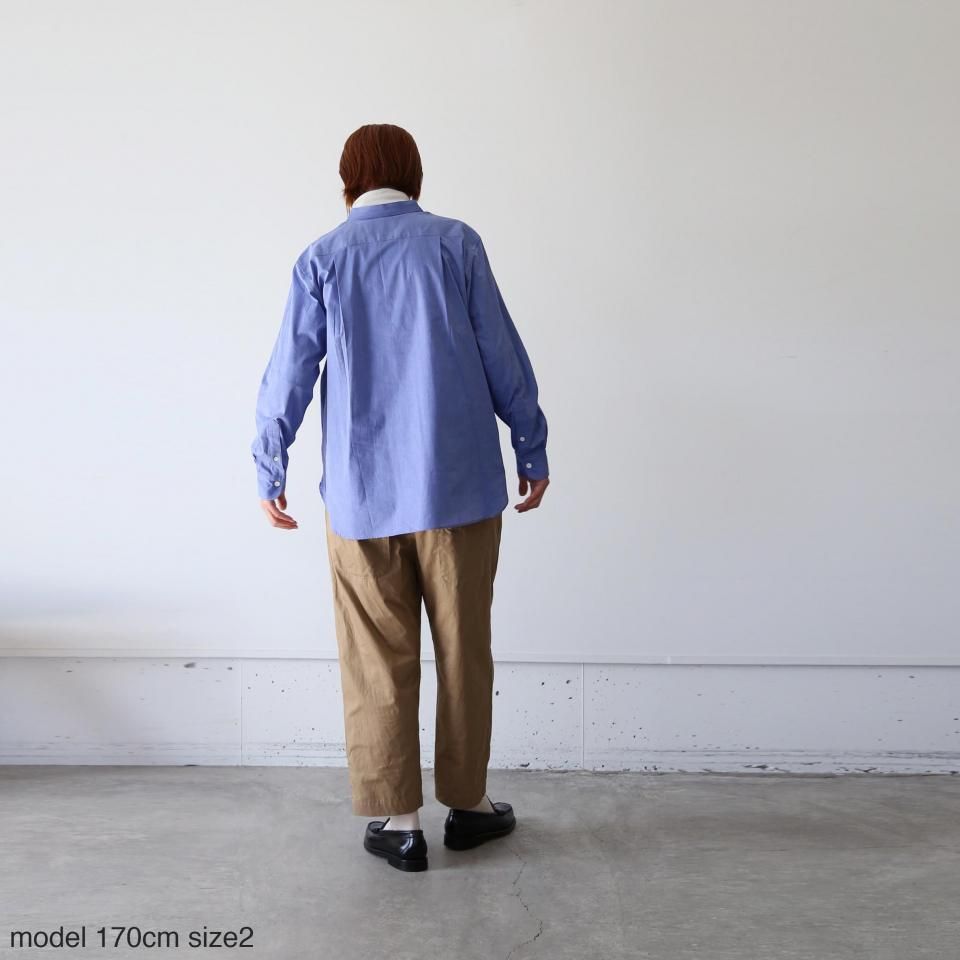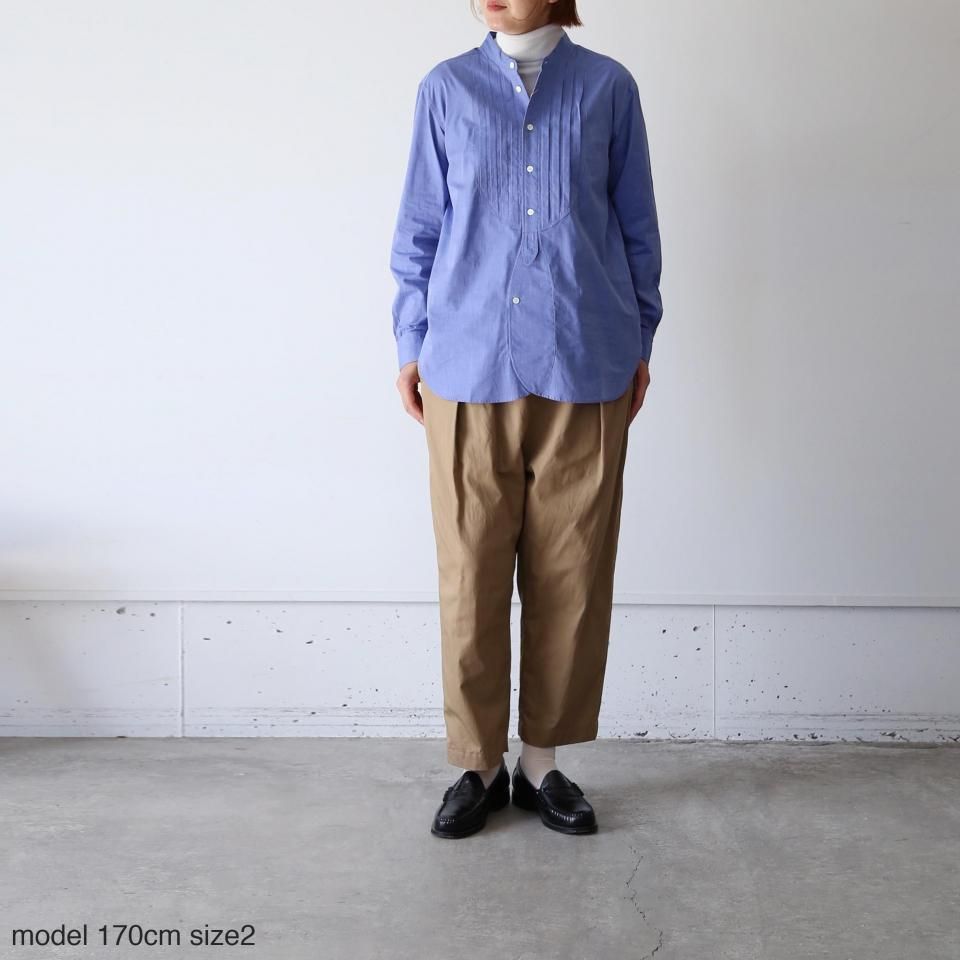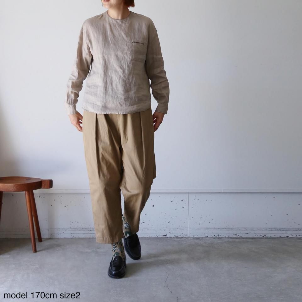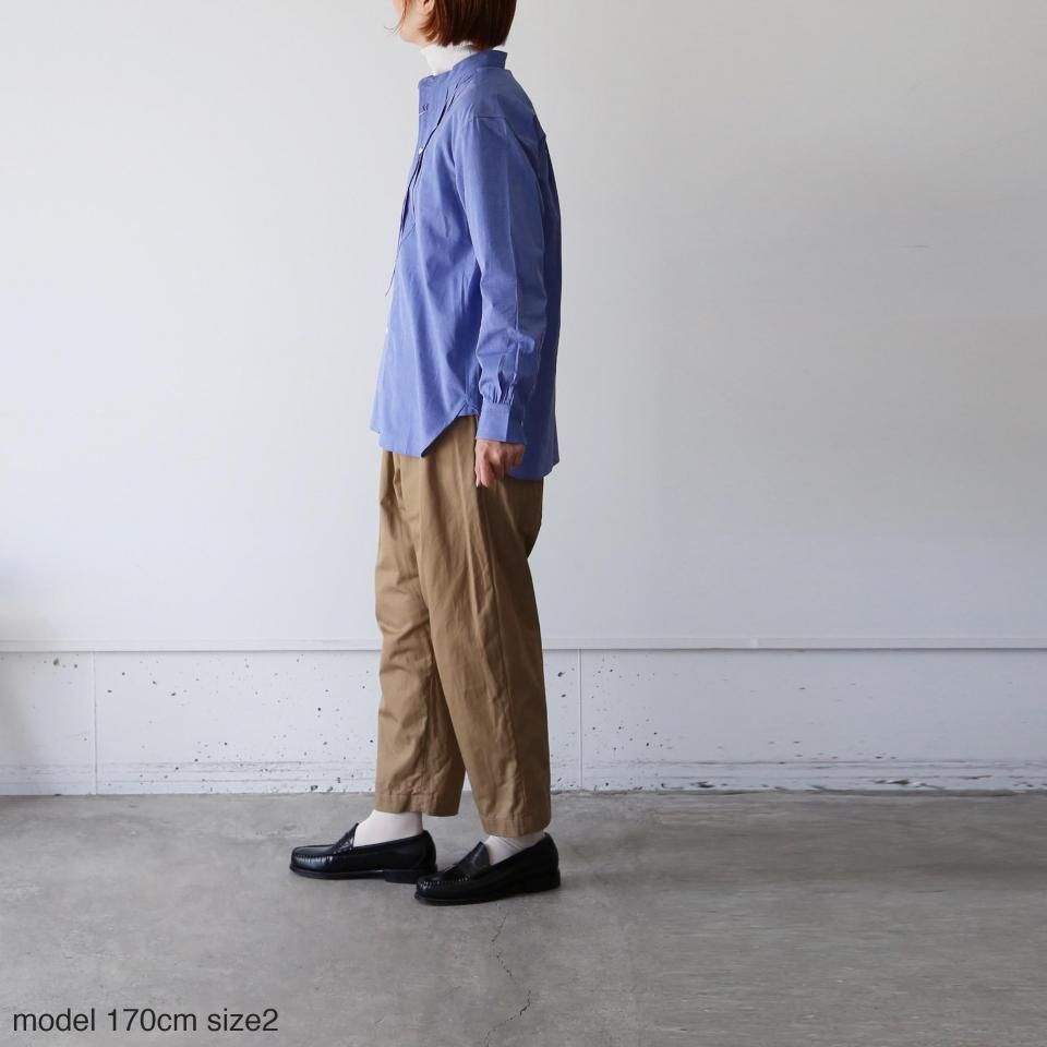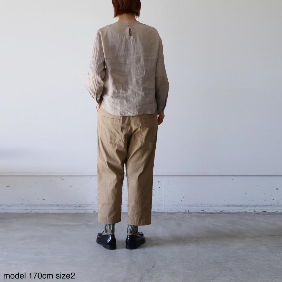 ヒップまわりにゆとりのある8分丈パンツです。 ビンテージチノクロスのハリ感で、やわらかな丸いフォルムが引き立ち、裾に向かってゆったりテーパードなラインに仕上がっています。足首が見える丈感で、バランスよく肌見せして大人の抜け感を楽しんだり、ソックスで足元をポイントにしたり。 ウエストは幅広ゴムで、楽な穿き心地です。 カジュアルダウンしすぎない素材感なので、お仕事などにもデイリーに活躍し、ワードローブに欠かせないパンツになってくれそうです。 【商品在庫について】 web shopの在庫管理には注意を払っておりますが、実店舗で販売も行っているため、web shopへの在庫反映が若干遅れてしまう場合がございます。どうぞご了承ください。