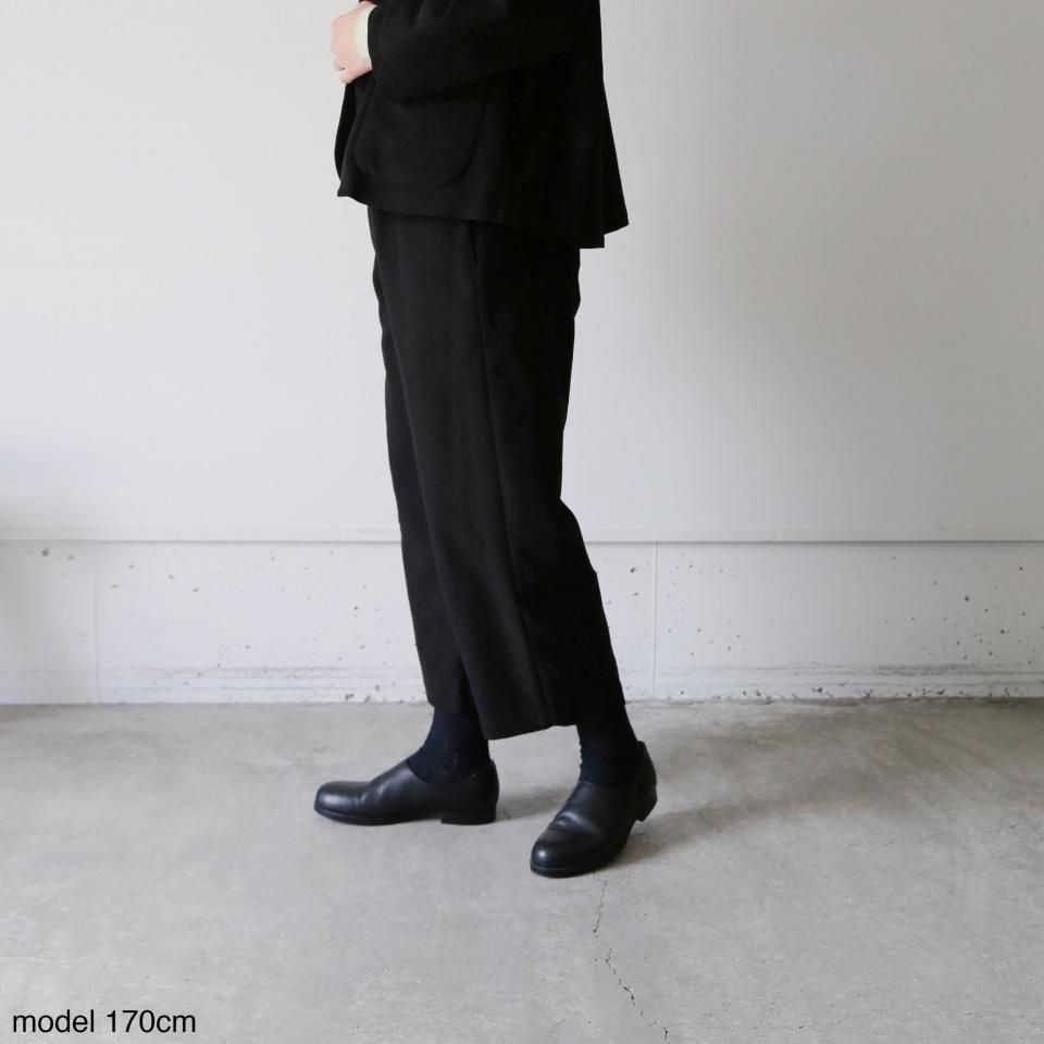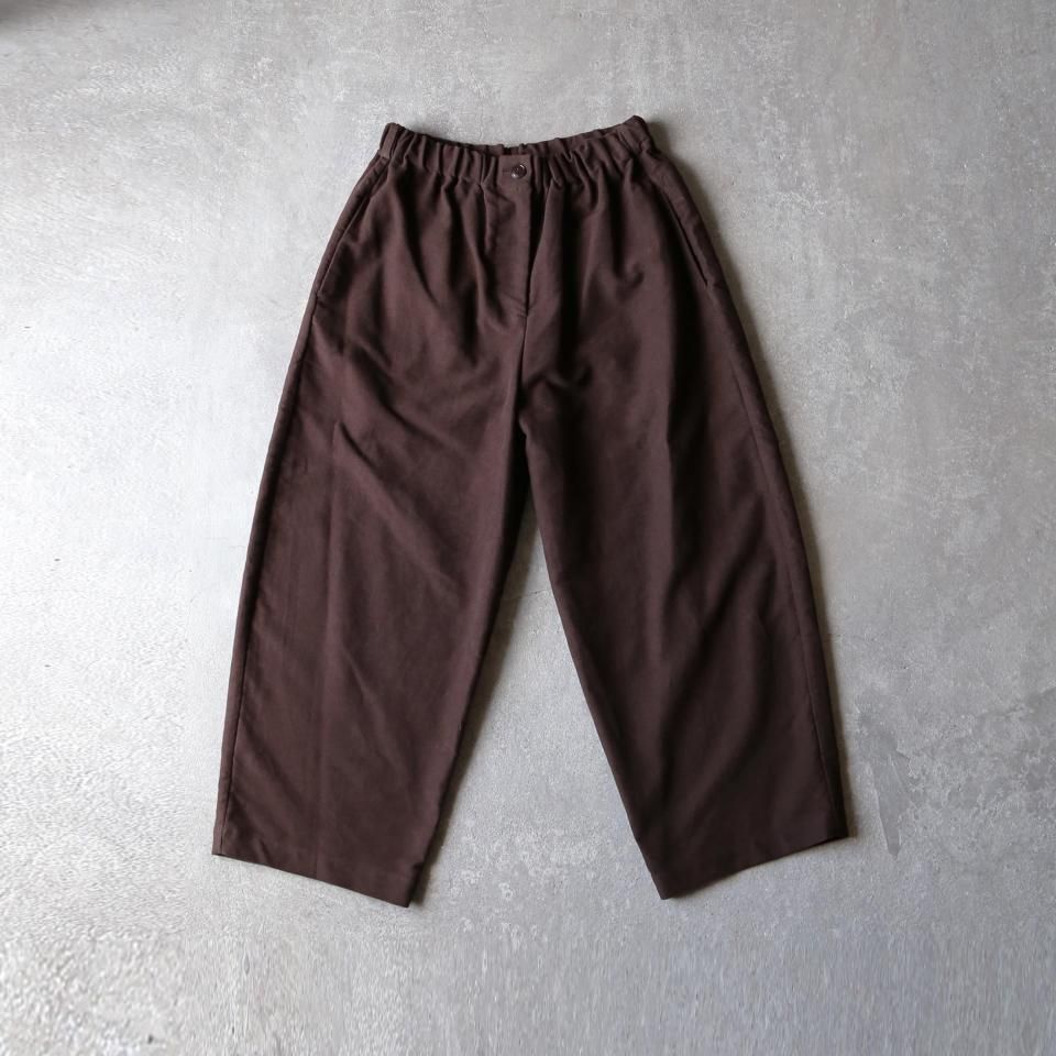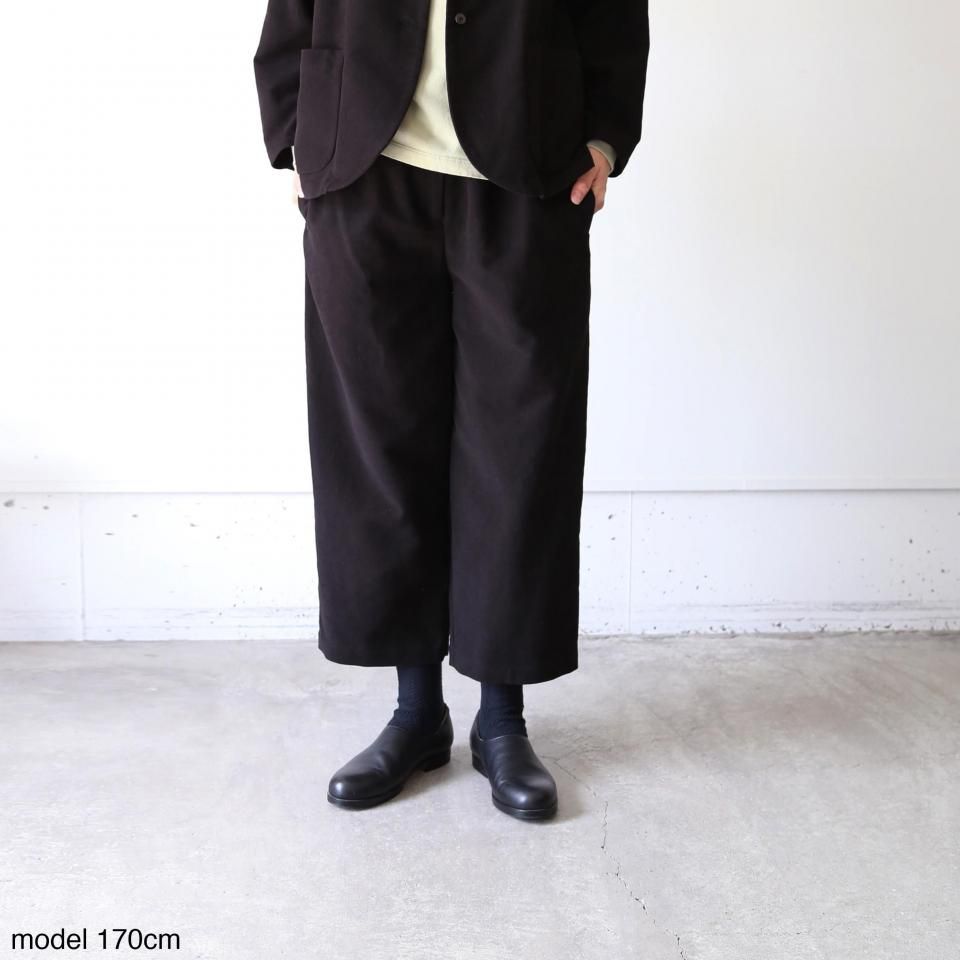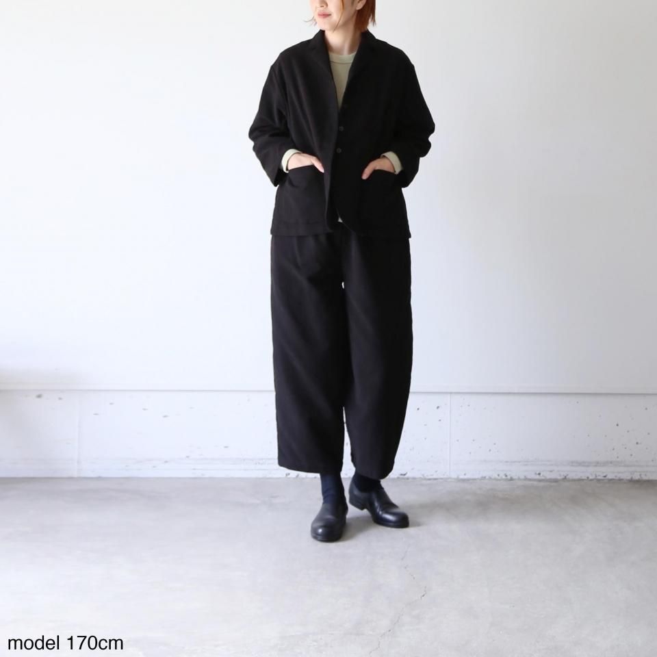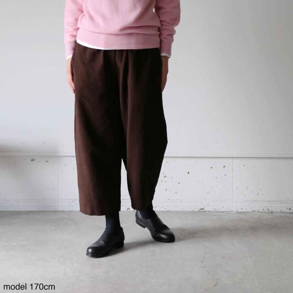 楽な穿き心地ながら、すっきりと見せてくれるボリュームのテーパードパンツ。 ゆったりと丸みのある、やわらかなシルエットです。 ほんのり起毛感のあるコットンで、ふっくら暖かみのある素材感です。 ウエストはゴムとファスナー前開き仕様です。内側の共布リボンでサイズ調節可能でです。 ネイビー、ブラックは、同素材のジャケットとのセットアップもおすすめです。秋冬のニットとラフに合わせて、単品使いでも活躍します。 【商品在庫について】 web shopの在庫管理には注意を払っておりますが、実店舗で販売も行っているため、web shopへの在庫反映が若干遅れてしまう場合がございます。どうぞご了承ください。