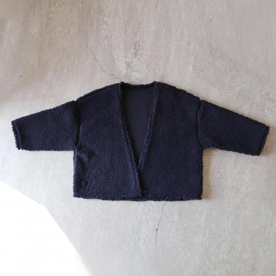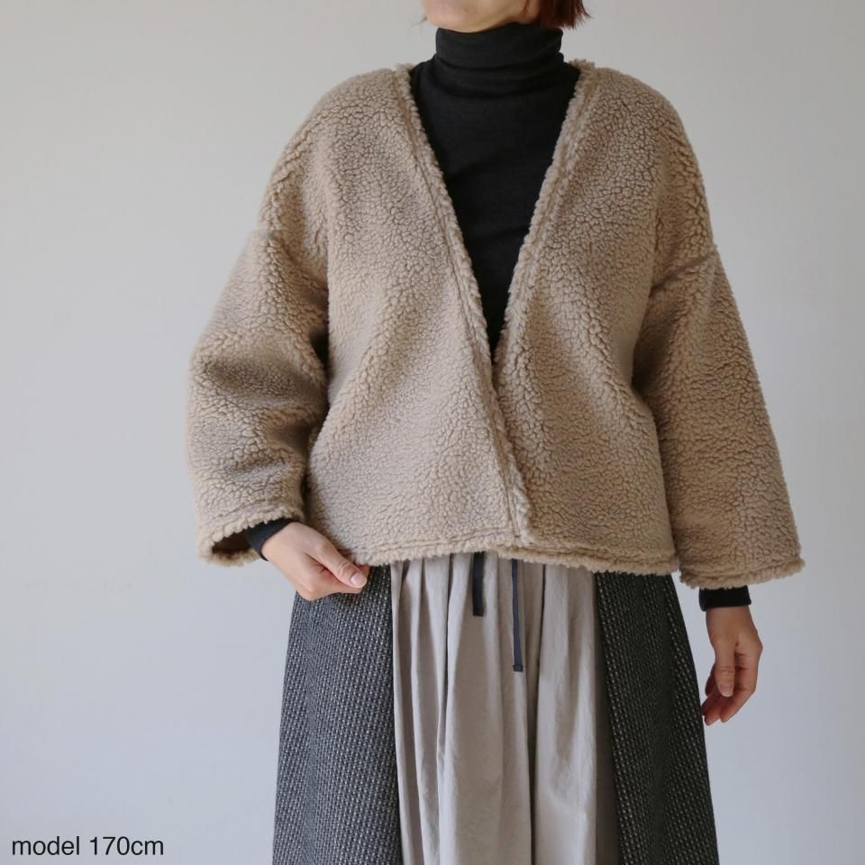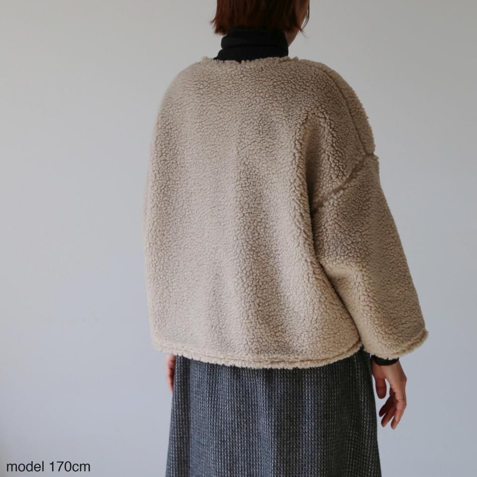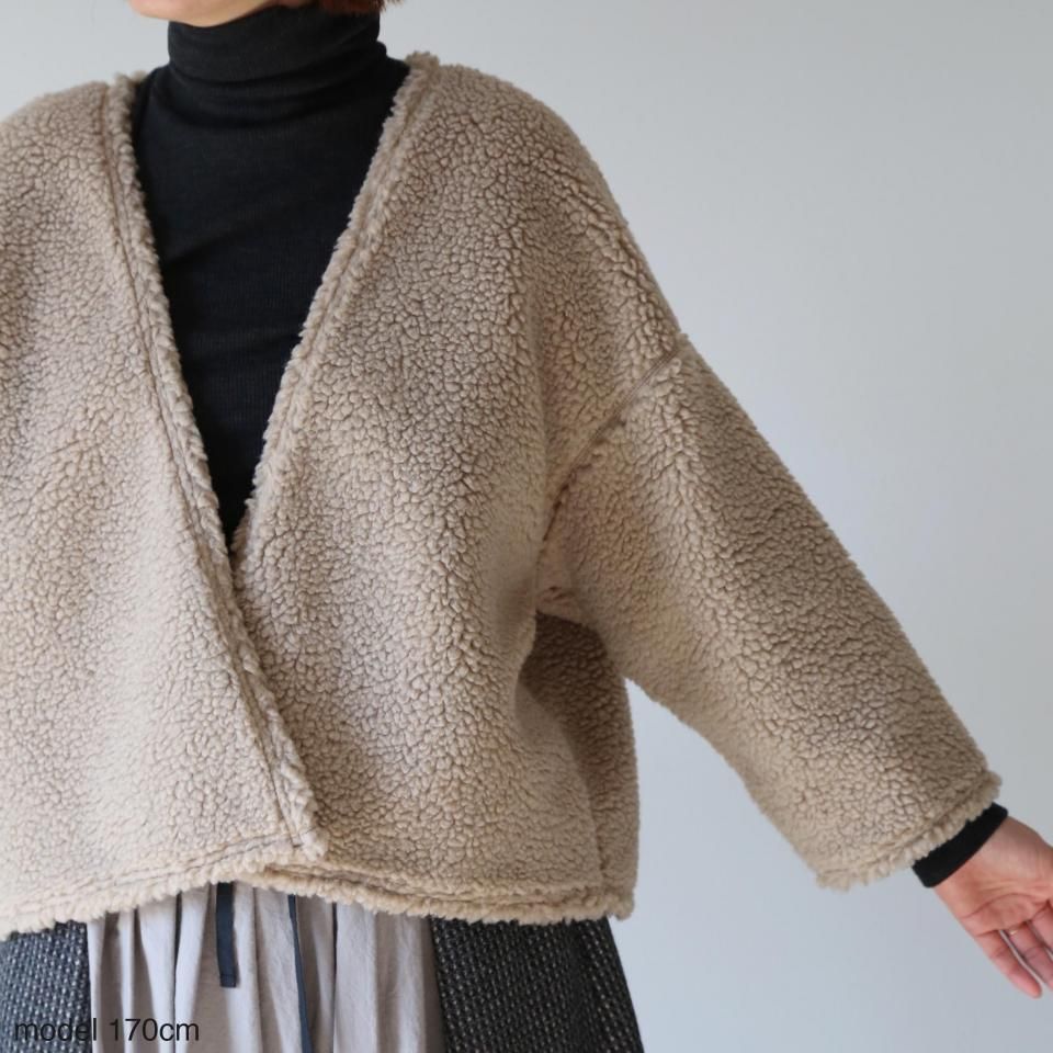 軽くてふんわりとしたボア素材がやさしく包み込む、あたたかな着心地の深Vカーディです。ゆったりとしたシルエットにショート丈のバランスがワンピースとの相性も抜群です。 ムートンを思わせるウォーム感あふれる風合いが特徴で、シンプルながらもこなれた雰囲気を演出します。 リバーシブル仕様ですので、気分やスタイリングに合わせて着回しがきくのも魅力。 フロントは付属のピンで自由に留めるデザインになっており、留め方のアレンジで幅広い着こなしをお楽しみいただけます。 リバーシブル仕様のため、ポケットは付いておりません。 【商品在庫について】 web shopの在庫管理には注意を払っておりますが、実店舗で販売も行っているため、web shopへの在庫反映が若干遅れてしまう場合がございます。どうぞご了承ください。