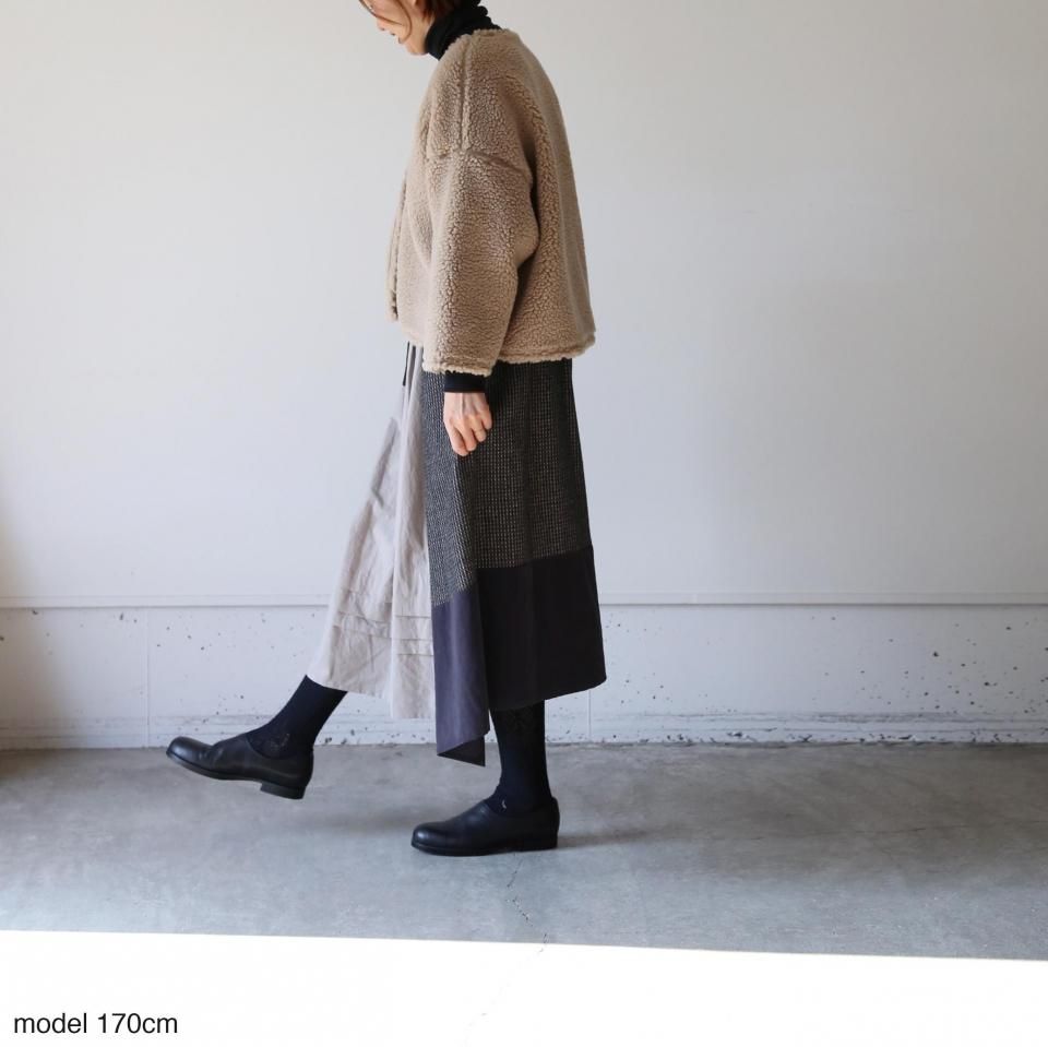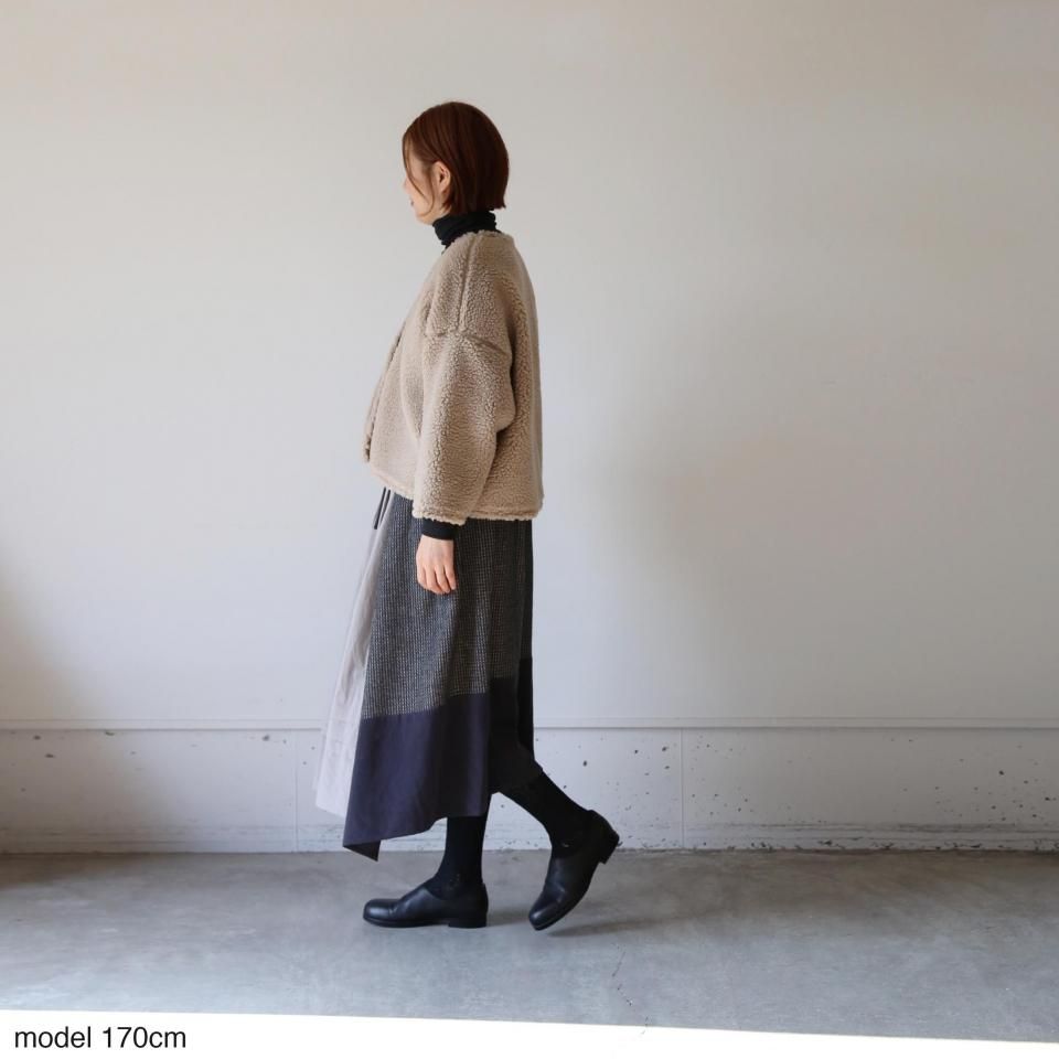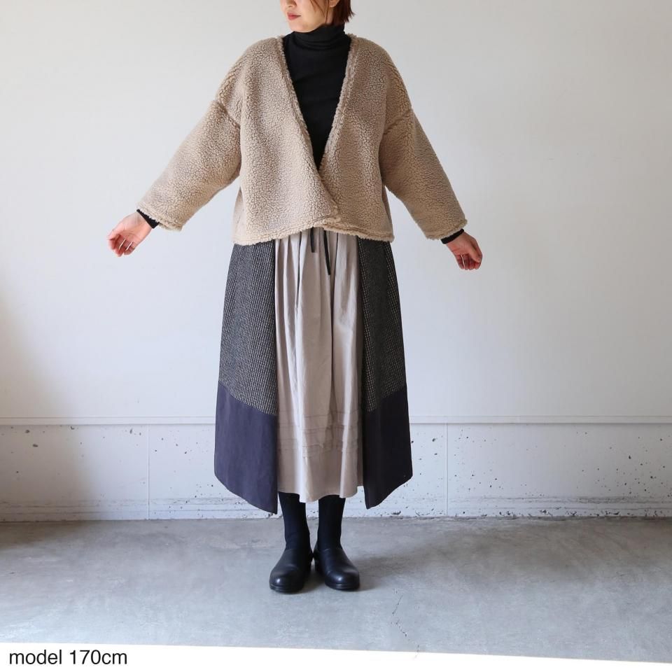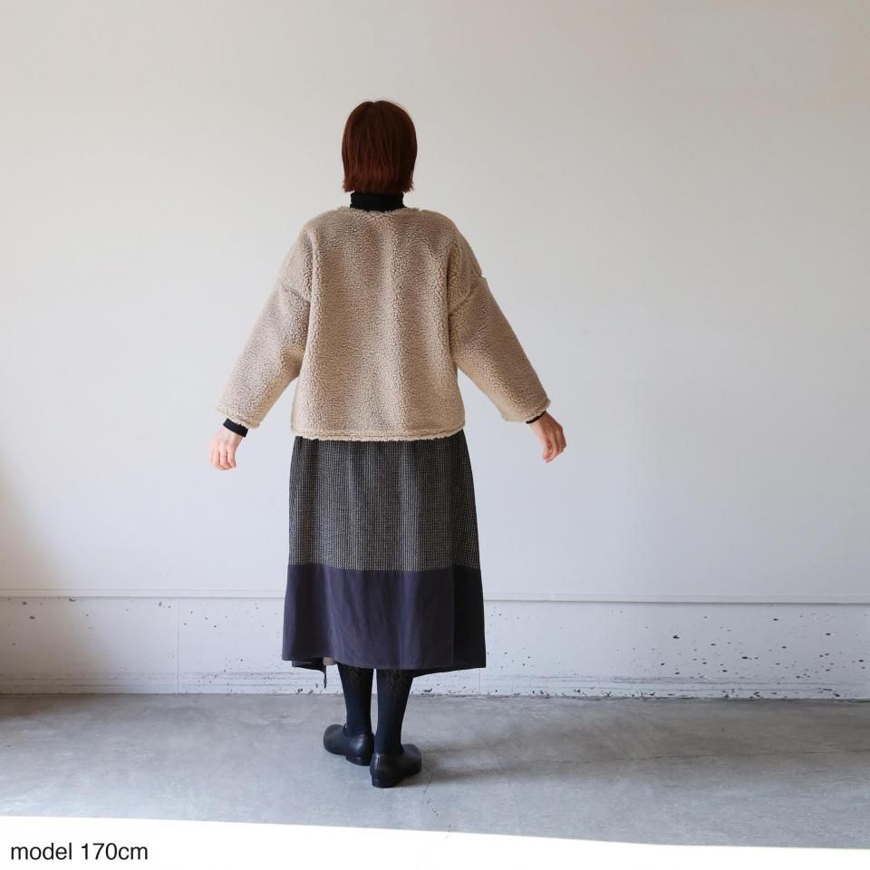 軽くてふんわりとしたボア素材がやさしく包み込む、あたたかな着心地の深Vカーディです。ゆったりとしたシルエットにショート丈のバランスがワンピースとの相性も抜群です。 ムートンを思わせるウォーム感あふれる風合いが特徴で、シンプルながらもこなれた雰囲気を演出します。 リバーシブル仕様ですので、気分やスタイリングに合わせて着回しがきくのも魅力。 フロントは付属のピンで自由に留めるデザインになっており、留め方のアレンジで幅広い着こなしをお楽しみいただけます。 リバーシブル仕様のため、ポケットは付いておりません。 【商品在庫について】 web shopの在庫管理には注意を払っておりますが、実店舗で販売も行っているため、web shopへの在庫反映が若干遅れてしまう場合がございます。どうぞご了承ください。