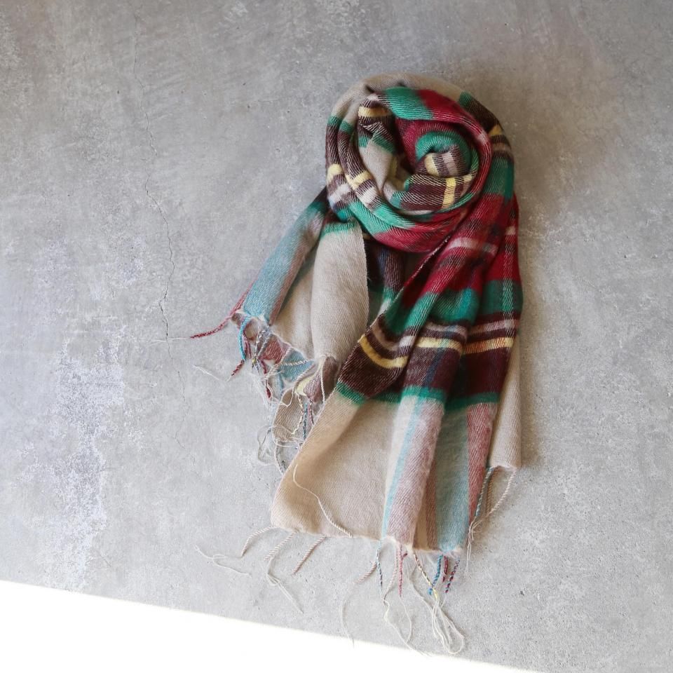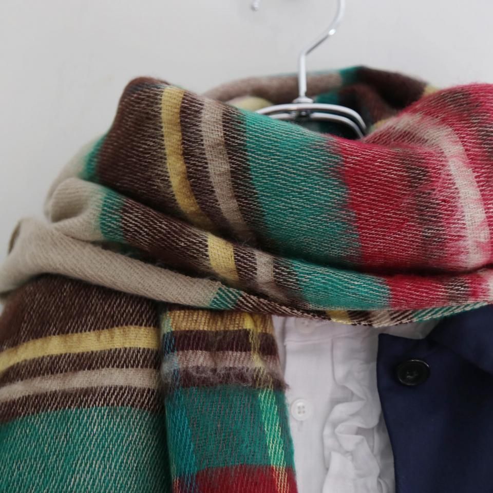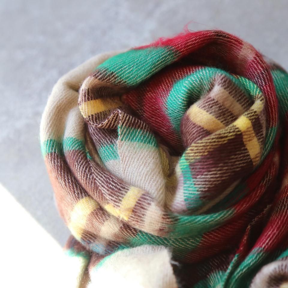 やさしいベージュカラーをベースに、レッド、ブラウン、グリーン、イエローの配色が映える、タータンチェックストールです。