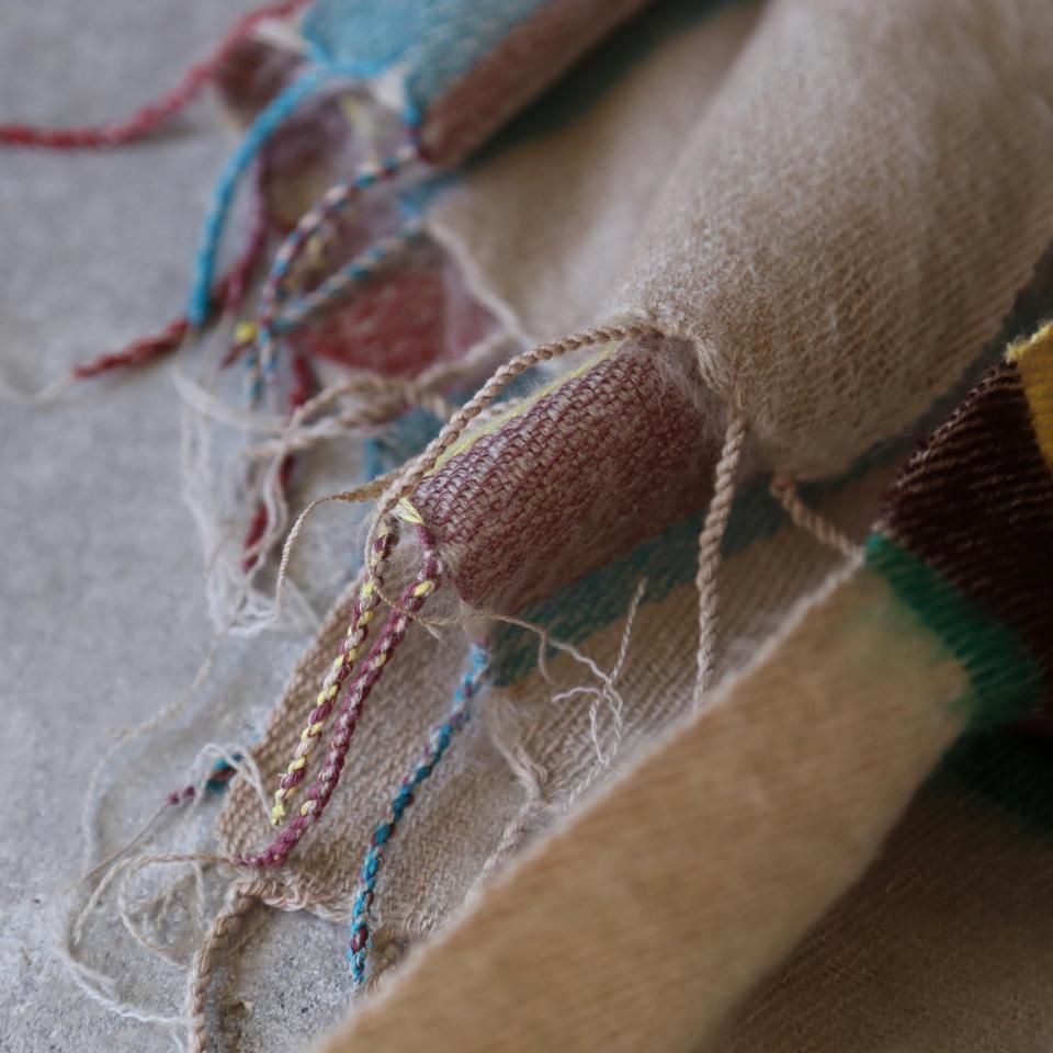 大判で、肩に羽織ったり、ひざ掛けにしたりと使い勝手の良いサイズ感です。くるくると巻くと丁度良いボリュームが出ます。