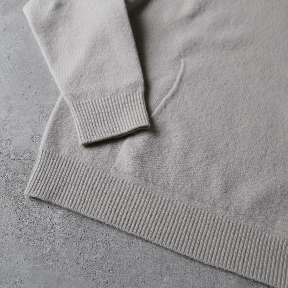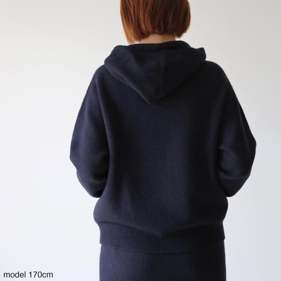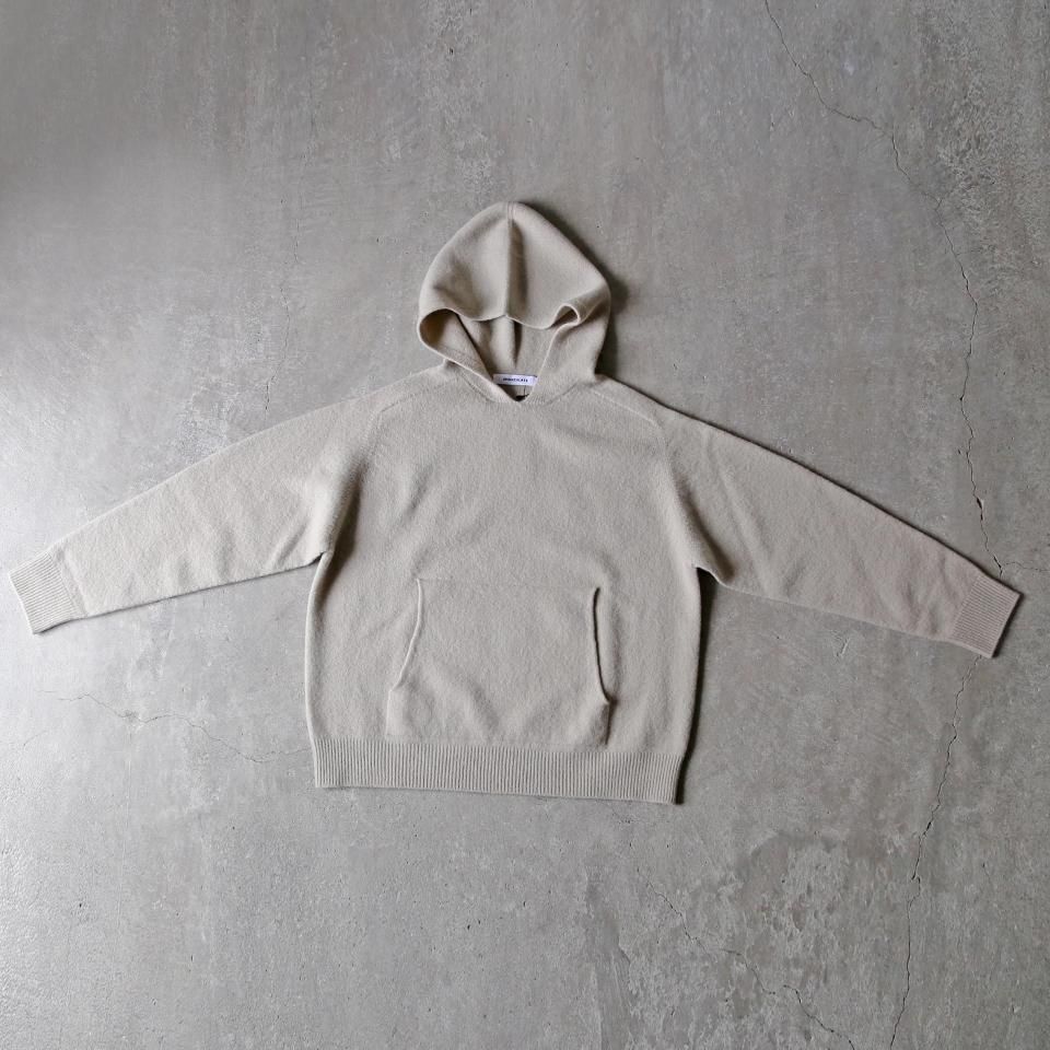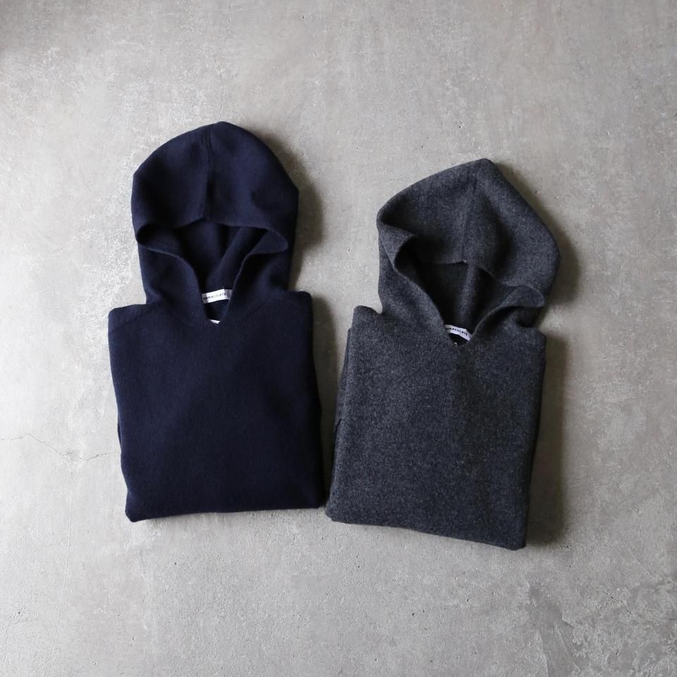 カジュアルに合わせられるフード付きのプルオーバーです。編みで作った大きなカンガルーポケットがポイントになっています。 糸の内部に多くの空気を含み、とても軽くてふくらみがあり、ソフトな肌触りが心地良いホールガーメントニット。強縮加工をすることにより、編み目が詰まり保温性が高く、軽くてあたたかな着心地です。 袖口、裾はリブ編みが付いていない仕様なので、シャツやカットソーとレイヤードしていただいてもおさまりが良く、ニュアンスの出るシルエットが魅力的な一枚です。 【商品在庫について】 web shopの在庫管理には注意を払っておりますが、実店舗で販売も行っているため、web shopへの在庫反映が若干遅れてしまう場合がございます。どうぞご了承ください。