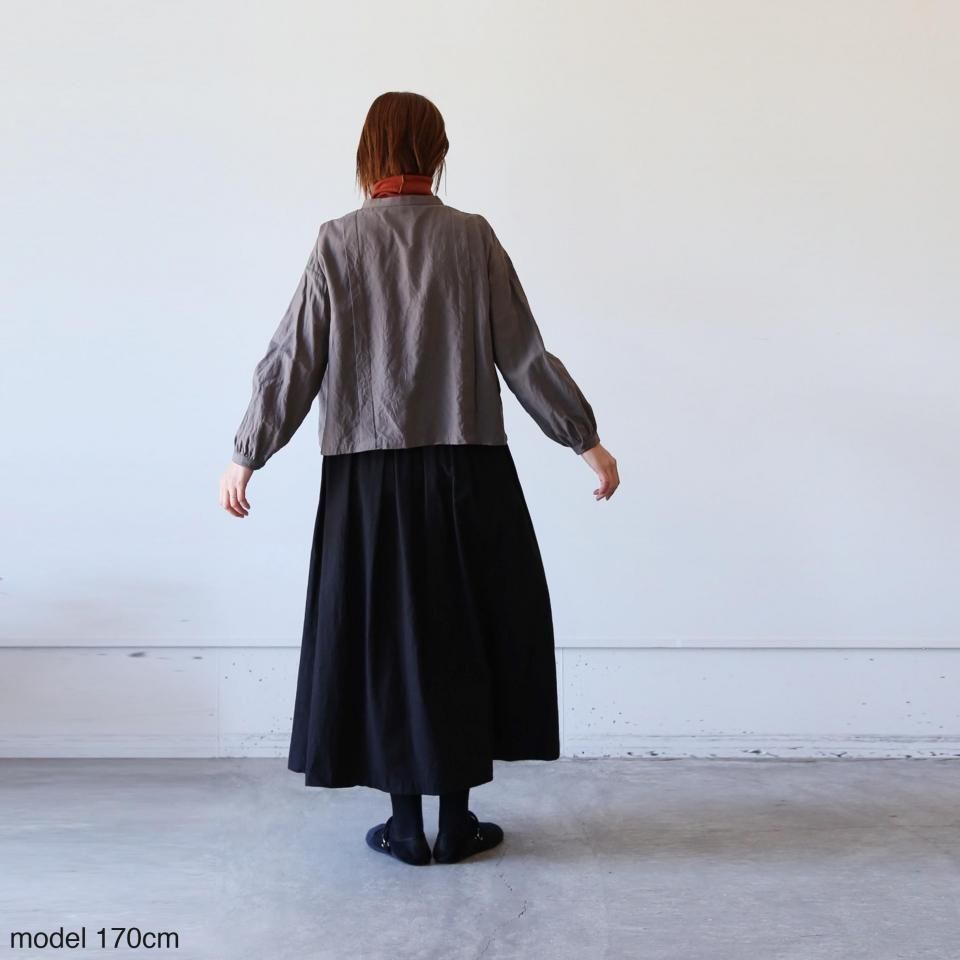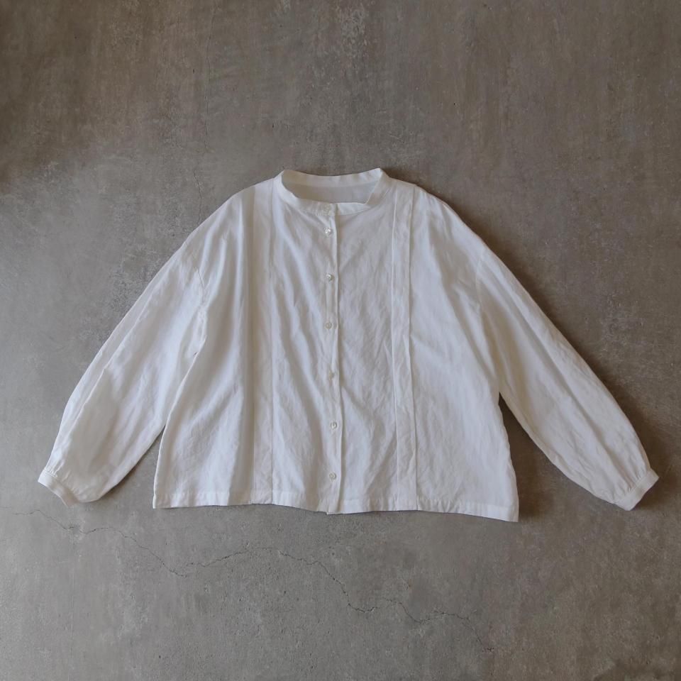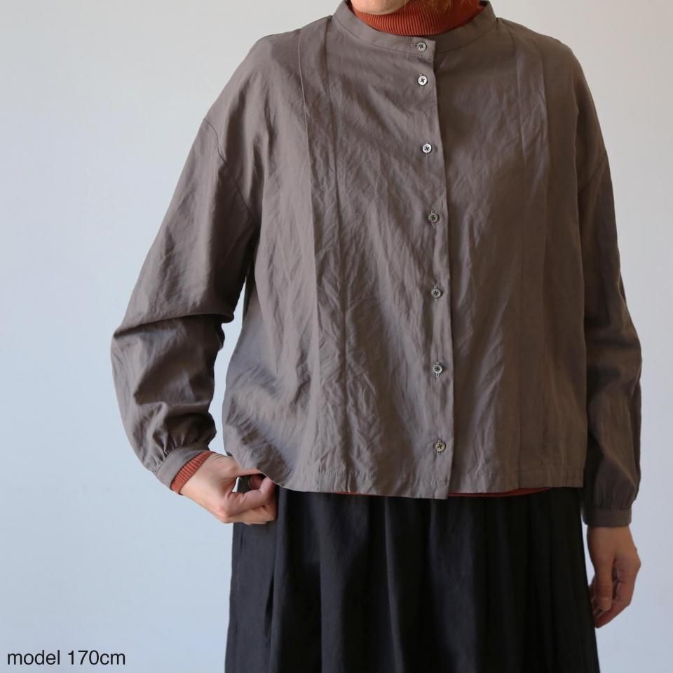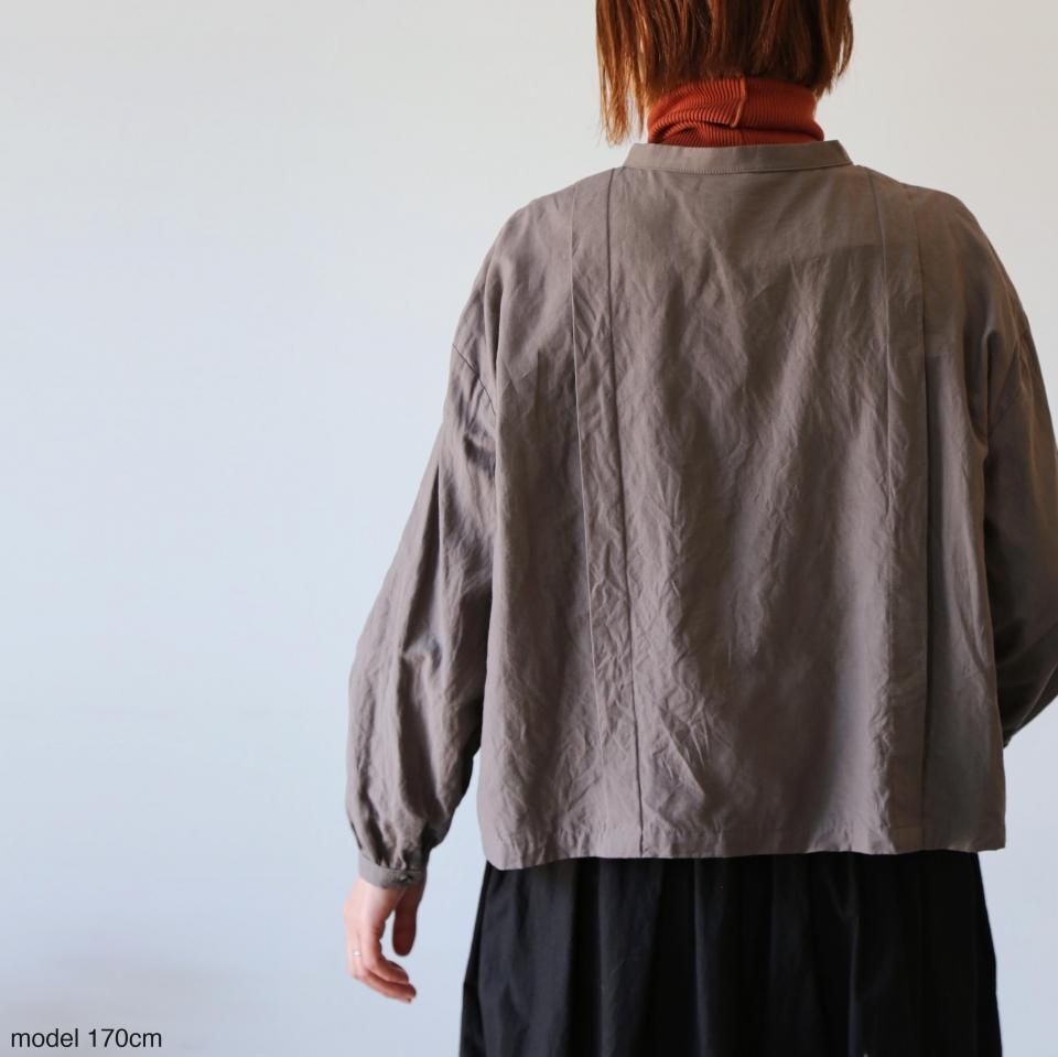 前身頃と後ろ身頃にタックを入れたブラウス。 小さなハイネックは窮屈感もなく、すっきりと上品な襟元を演出。 あたたかなタートルをインして、ふわっと羽織っても、優しい雰囲気で着こなせる一枚です。 コットンとラミー(麻)のナチュラルな素材感の中に、ほんのり艶やかな光沢が感じられ、きれいめなコーディネートにも活躍するブラウスです。 【商品在庫について】 web shopの在庫管理には注意を払っておりますが、実店舗で販売も行っているため、web shopへの在庫反映が若干遅れてしまう場合がございます。どうぞご了承ください。