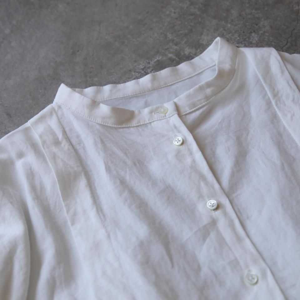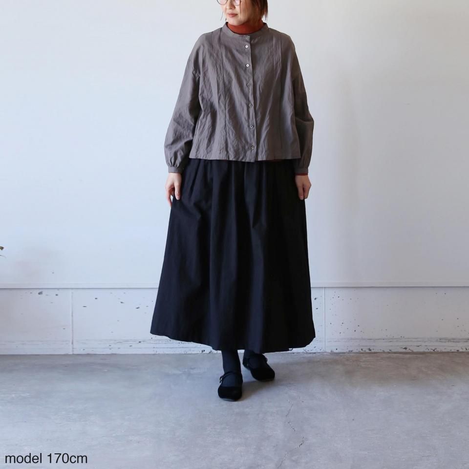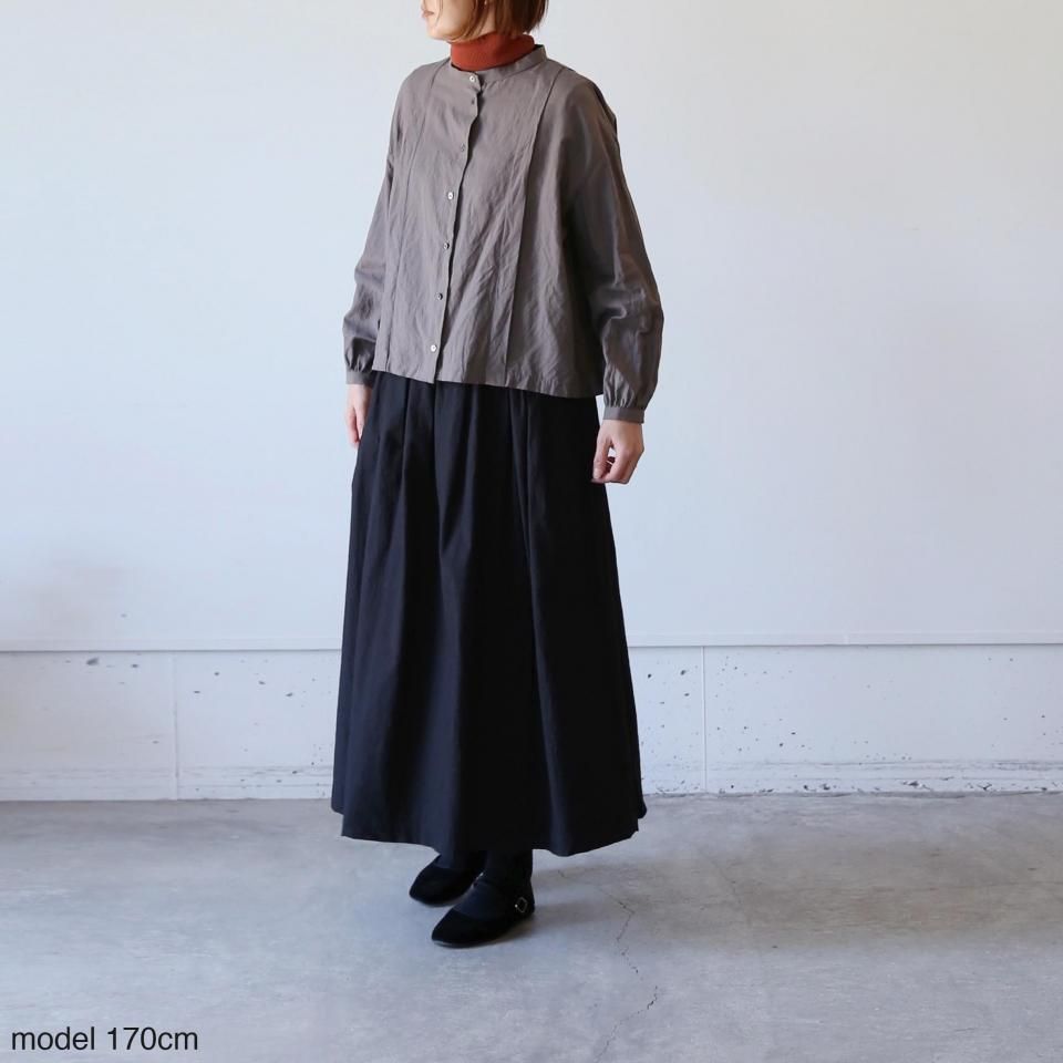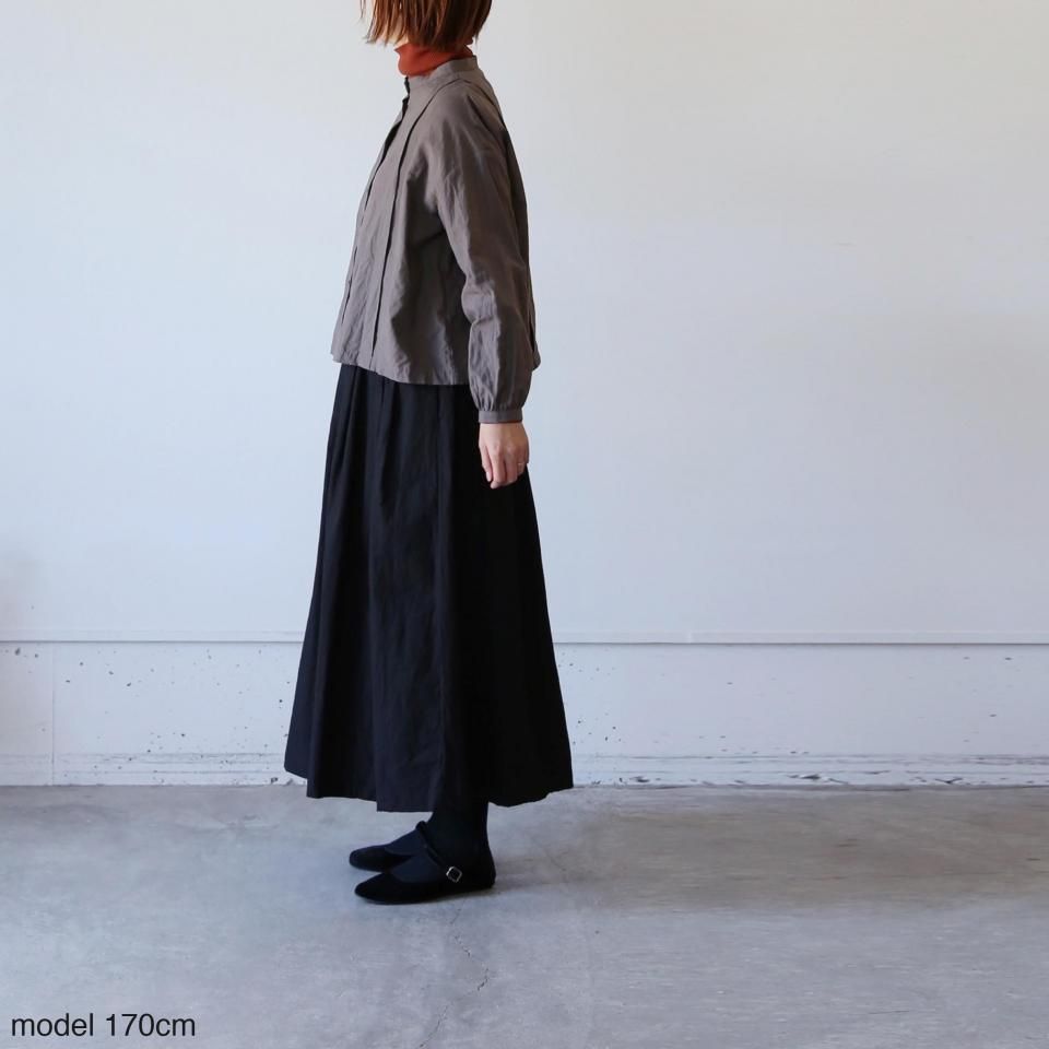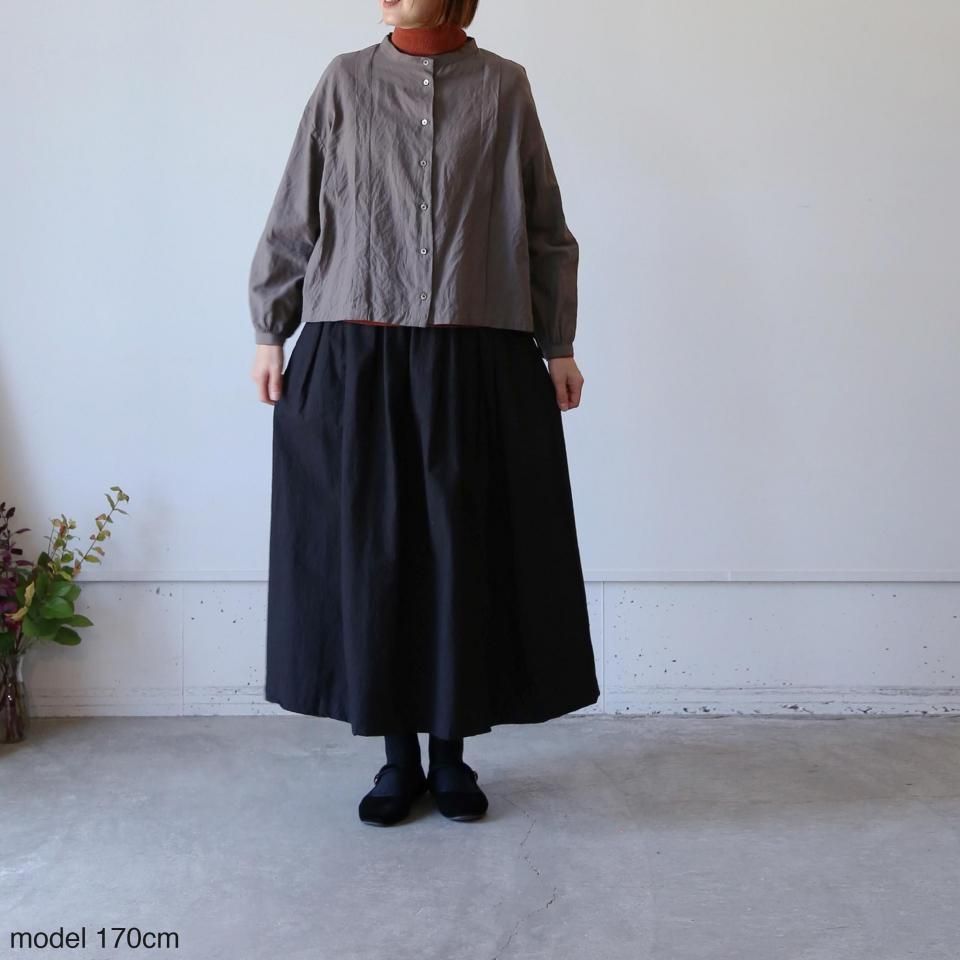 前身頃と後ろ身頃にタックを入れたブラウス。 小さなハイネックは窮屈感もなく、すっきりと上品な襟元を演出。 あたたかなタートルをインして、ふわっと羽織っても、優しい雰囲気で着こなせる一枚です。 コットンとラミー(麻)のナチュラルな素材感の中に、ほんのり艶やかな光沢が感じられ、きれいめなコーディネートにも活躍するブラウスです。 【商品在庫について】 web shopの在庫管理には注意を払っておりますが、実店舗で販売も行っているため、web shopへの在庫反映が若干遅れてしまう場合がございます。どうぞご了承ください。