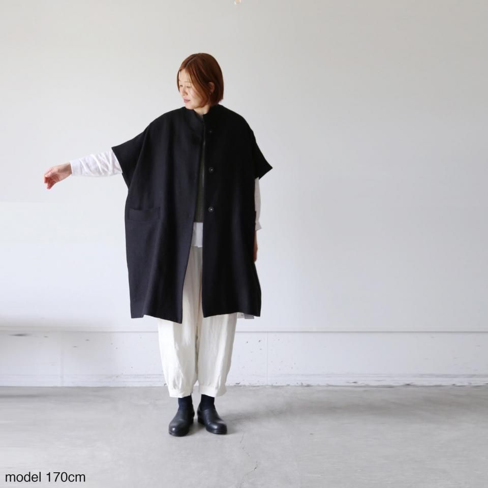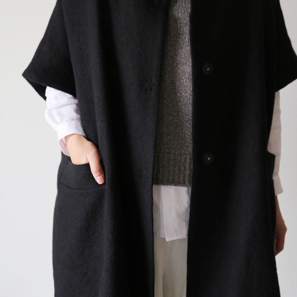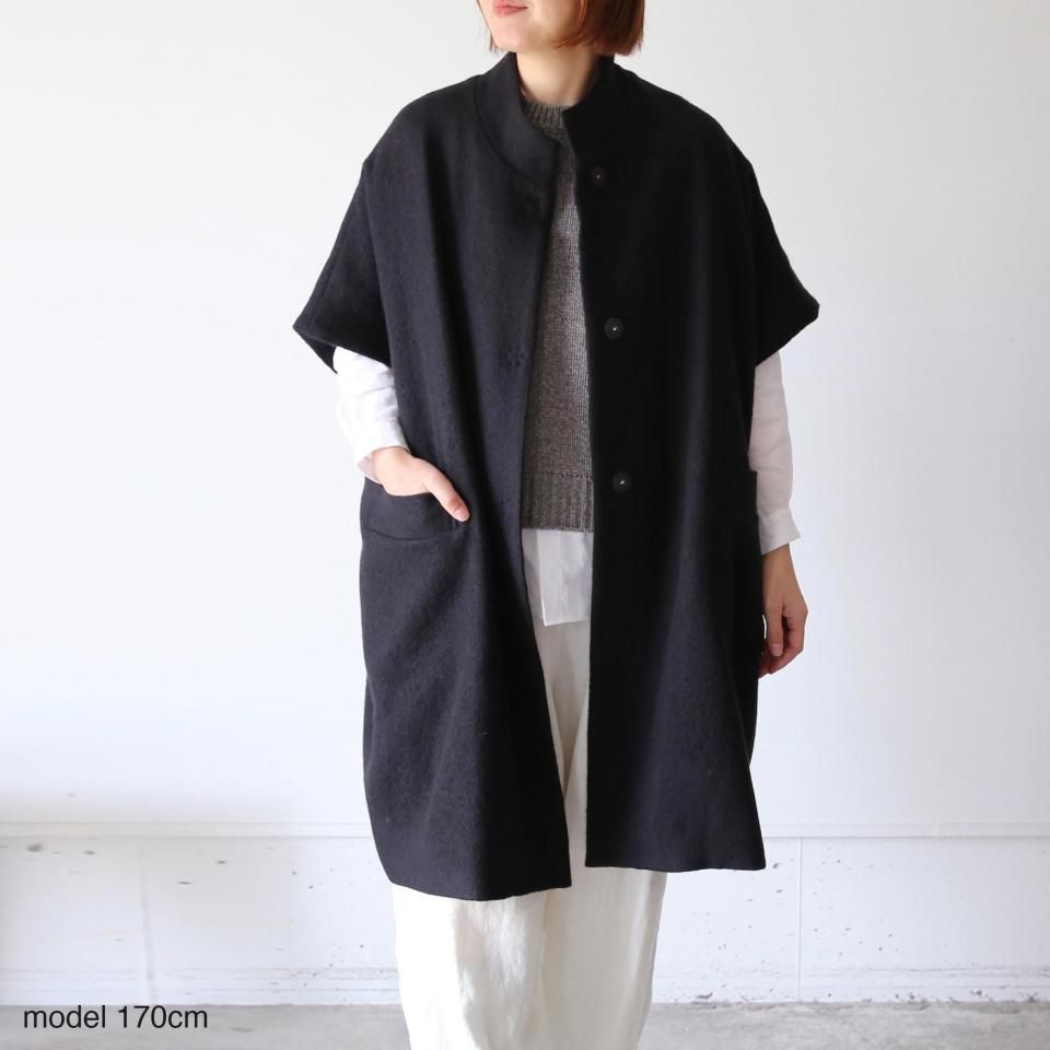 たっぷり身幅で、厚手のニットにも楽に羽織っていただけるショートスリーブのウールコートです。