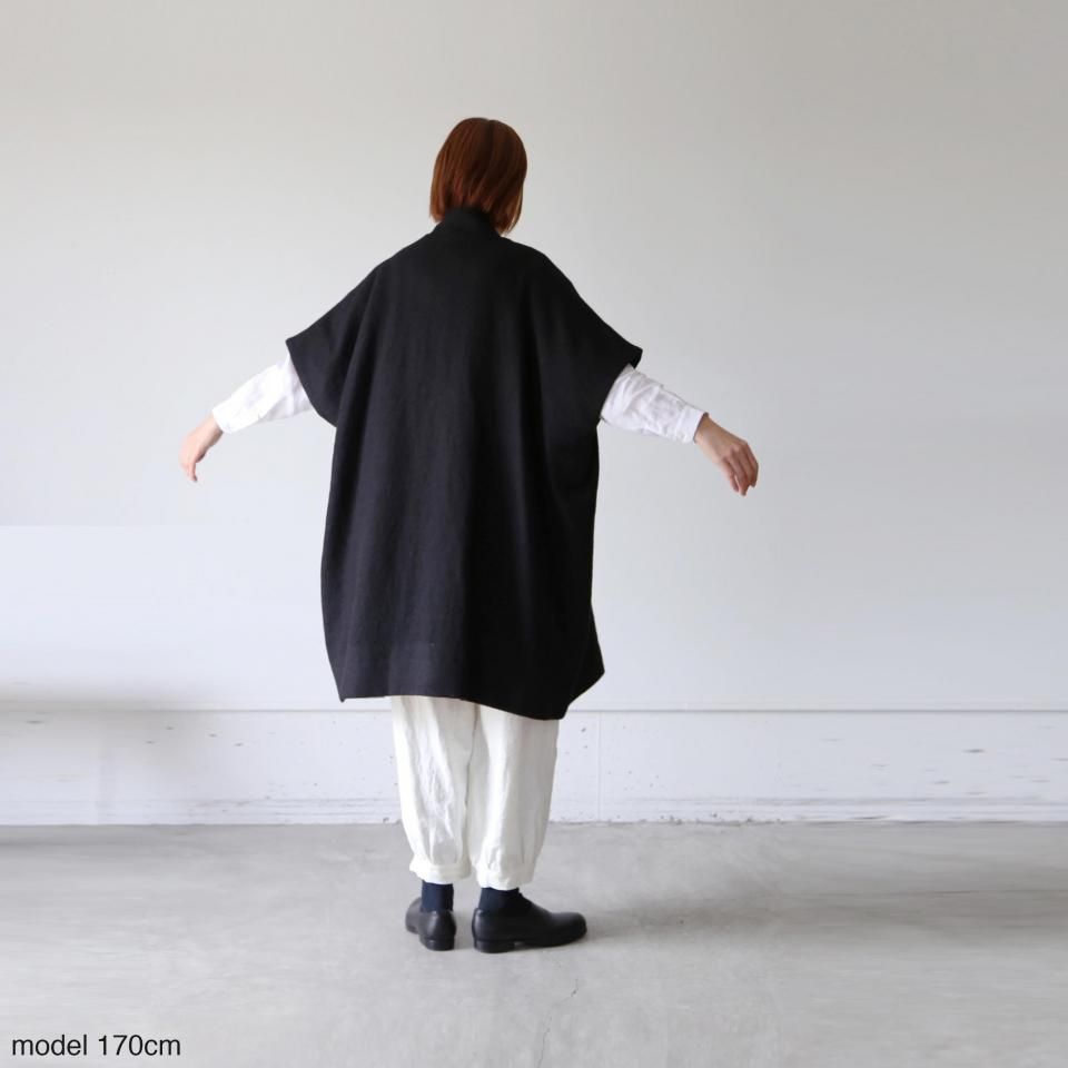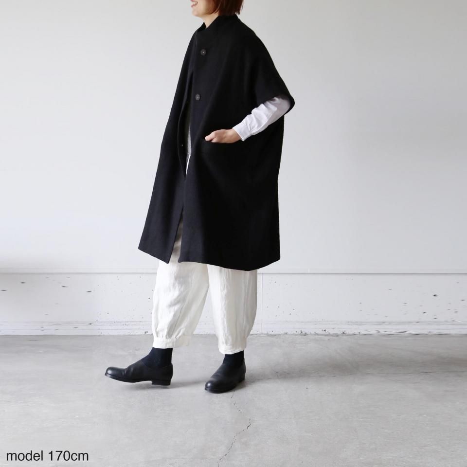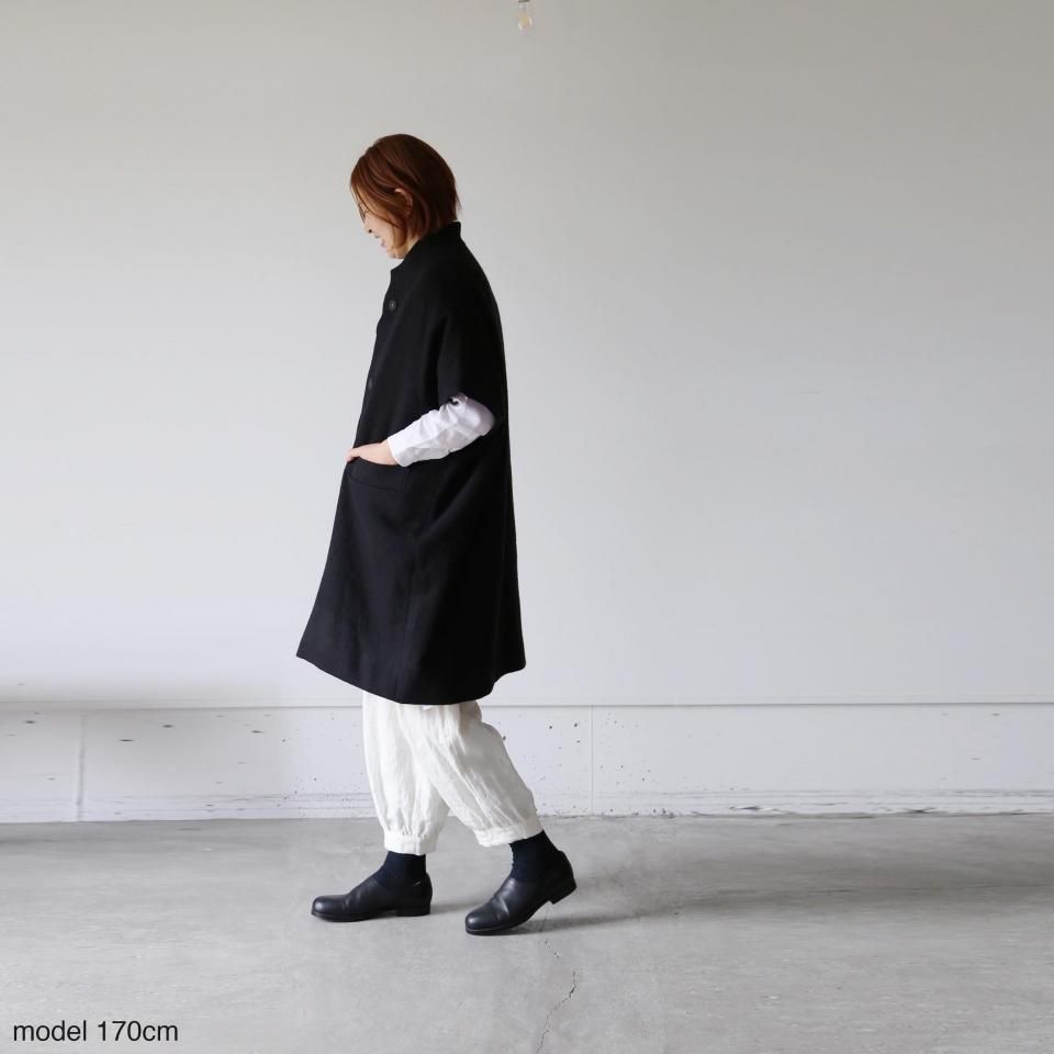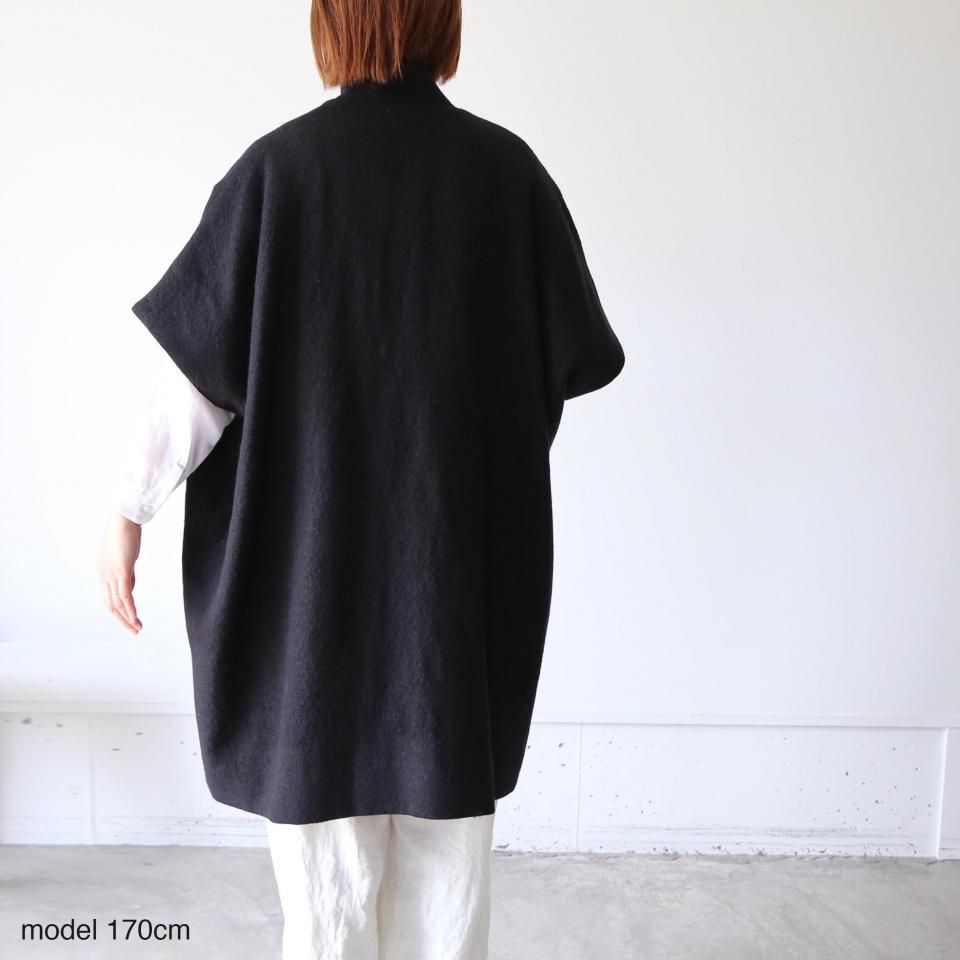たっぷり身幅で、厚手のニットにも楽に羽織っていただけるショートスリーブのウールコートです。