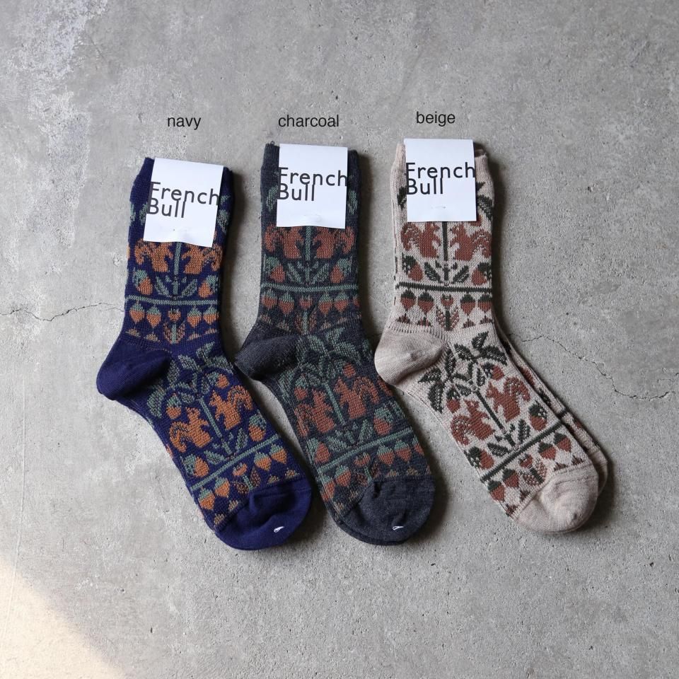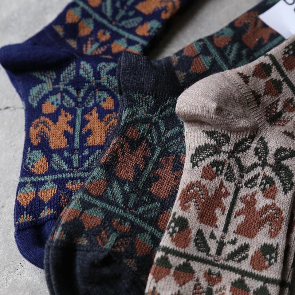 どんぐりの木とリスの柄の秋冬ソックスです。ジャガード編みの凹凸で表現した柄がポイント。 やわらかく上質なメリノウール糸をベースに、程良い厚みに編み立てられた心地良い一足。 落ち着いたお色味で合わせやすく、デイリーに活躍します。 【ネコポス、クロネコゆうパケット対応商品について】 こちらの商品は3点以内のお買い上げ時のみ、ネコポス、クロネコゆうパケットがご利用いただけます。 4点以上のお買い上げ、他にご注文商品がある場合や、お急ぎのお客様は、宅急便での通常配送をお選びくださいませ。 【商品在庫について】 web shopの在庫管理には注意を払っておりますが、実店舗で販売も行っているため、web shopへの在庫反映が若干遅れてしまう場合がございます。どうぞご了承ください。